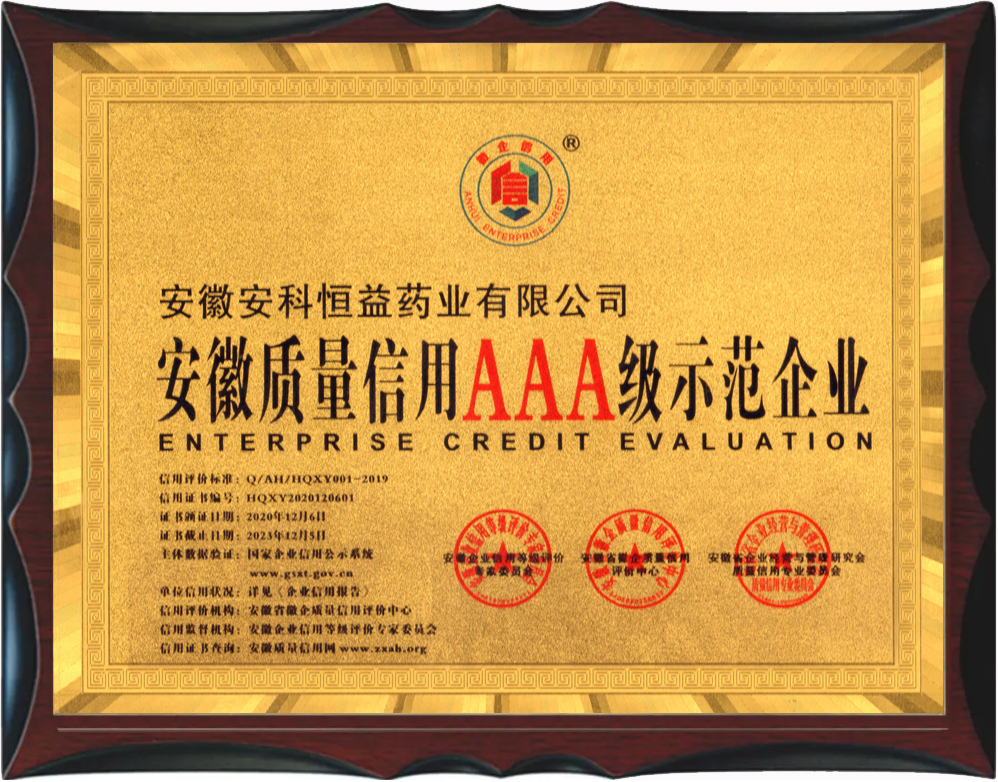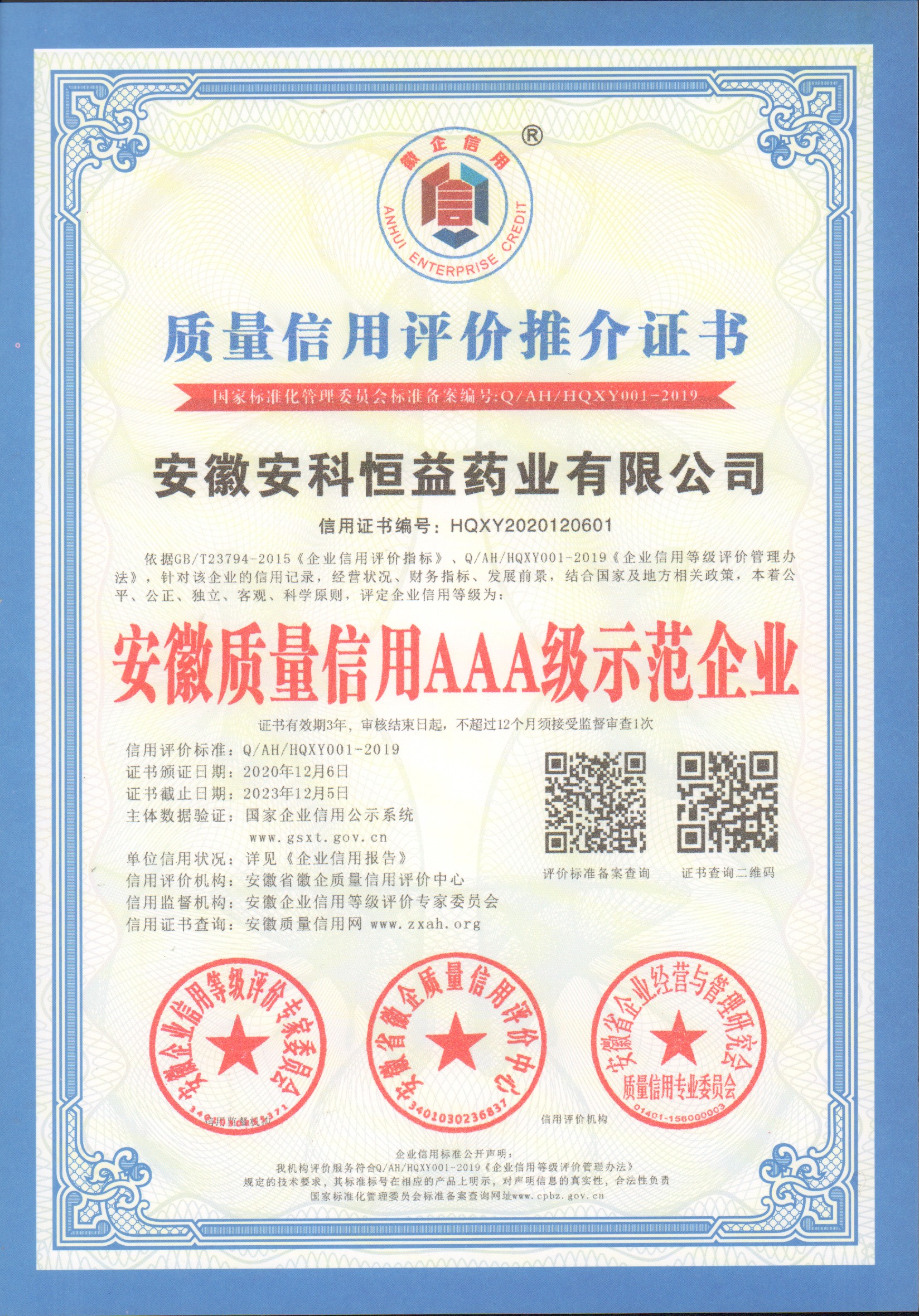 安徽省徽企質(zhì)量信用評價中心和安徽企業(yè)信用等級評價專家委員會依據(jù)GB/T23794-2015《企業(yè)信用評價指標(biāo)》、Q/AH/HQXY001-2019《企業(yè)信用等級評價管理辦法》,針對我公司的信用記錄、經(jīng)營狀況、財務(wù)指標(biāo)、發(fā)展前景,結(jié)合國家及地方相關(guān)政策,本著公平、公正、獨立、客觀、科學(xué)原則,評定公司企業(yè)信用等級為:安徽質(zhì)量信用AAA級示范企業(yè)。并頒發(fā)了獎牌及證書。