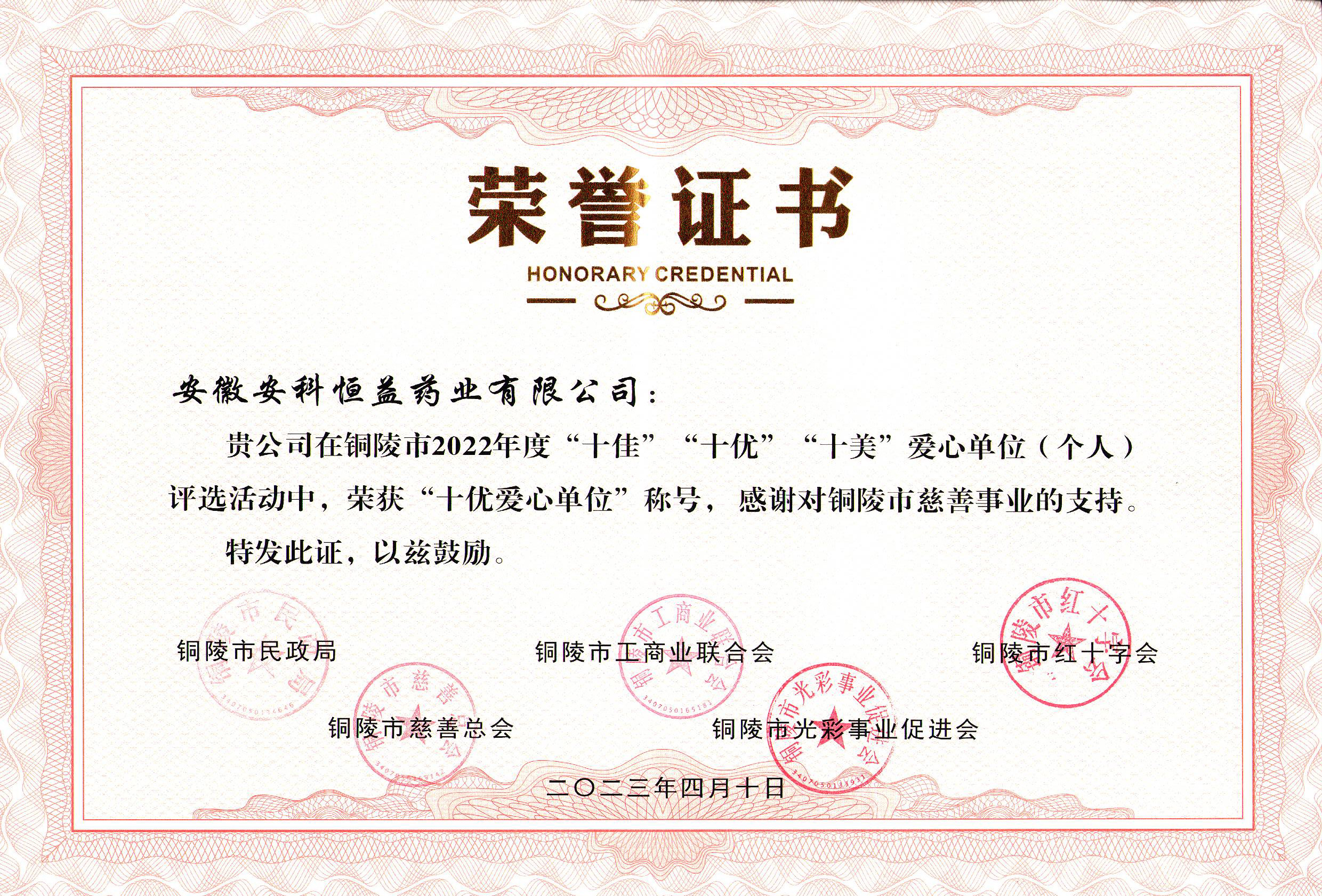 該榮譽稱號是由銅陵市民政局、銅陵工商聯合會、銅陵紅十字會、銅陵慈善總會、銅陵市光彩事業促進會聯合頒發,本次入選銅陵市“十優愛心單位”的企業都是在2022年度工作中支持慈善事業,發揮示范帶頭作用的先進企業。該榮譽的獲得肯定了過去一年里安科恒益藥業在疫情困難時期勇于擔當,回報社會,積極參與慈善事業的工作,是對安科恒益藥業積極履行企業社會責任整體表現的嘉獎,也將激勵安科恒益藥業在今后的工作中繼續投身慈善事業,為構建和諧社會積極貢獻企業的正能量。
