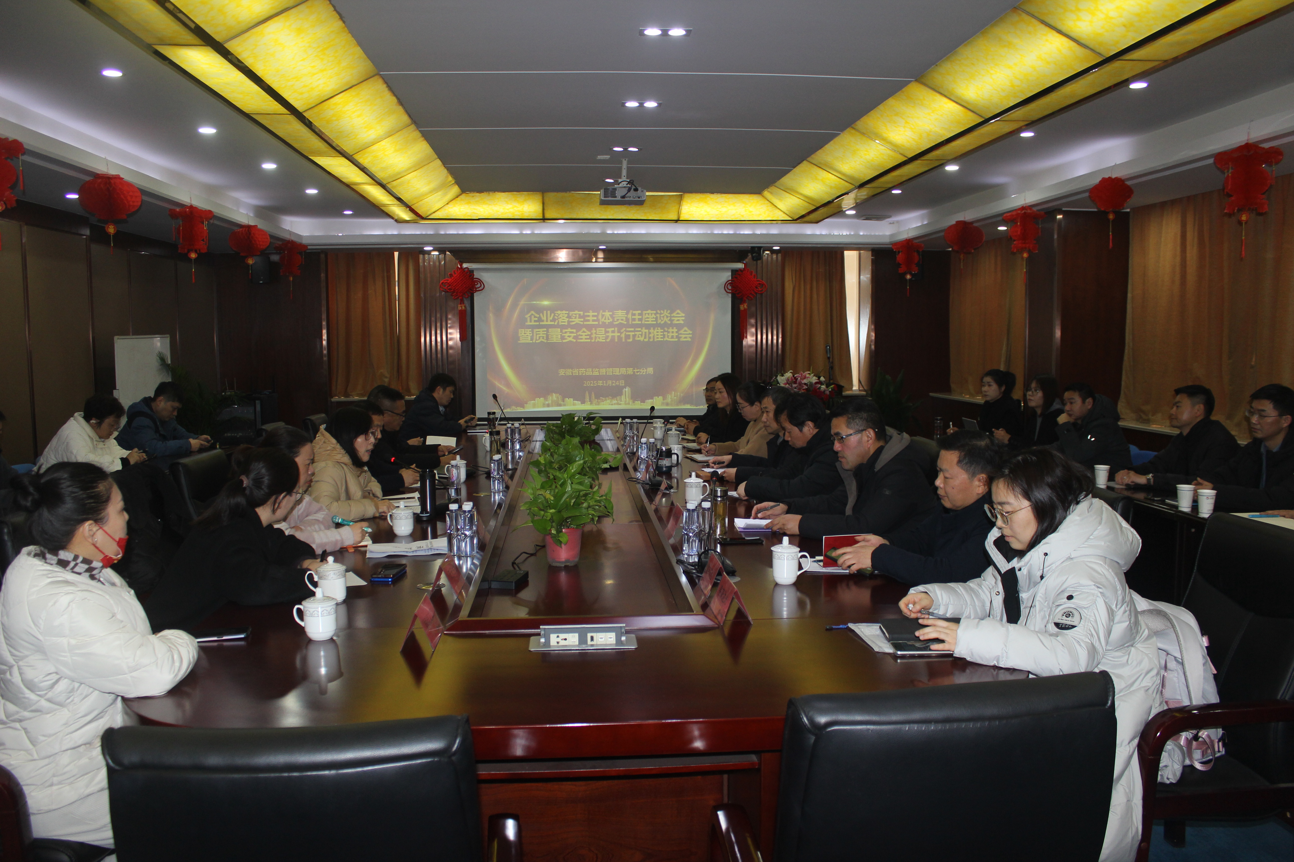 為進(jìn)一步落實(shí)企業(yè)質(zhì)量安全主體責(zé)任,提升藥械化企業(yè)質(zhì)量安全水平,促進(jìn)銅陵醫(yī)藥產(chǎn)業(yè)高質(zhì)量發(fā)展,2025年1月24日下午省藥品監(jiān)管局第七分局及銅陵市藥械化企業(yè)負(fù)責(zé)人、質(zhì)量負(fù)責(zé)人在公司會(huì)議室內(nèi)召開(kāi)“企業(yè)落實(shí)主體責(zé)任座談會(huì)暨質(zhì)量安全提升行動(dòng)工作推進(jìn)會(huì)”。參加會(huì)議的有省藥品監(jiān)管局第七分局虞舜來(lái)局長(zhǎng)、倪敏處長(zhǎng)。座談會(huì)由第七分局甘傳會(huì)科長(zhǎng)主持。
